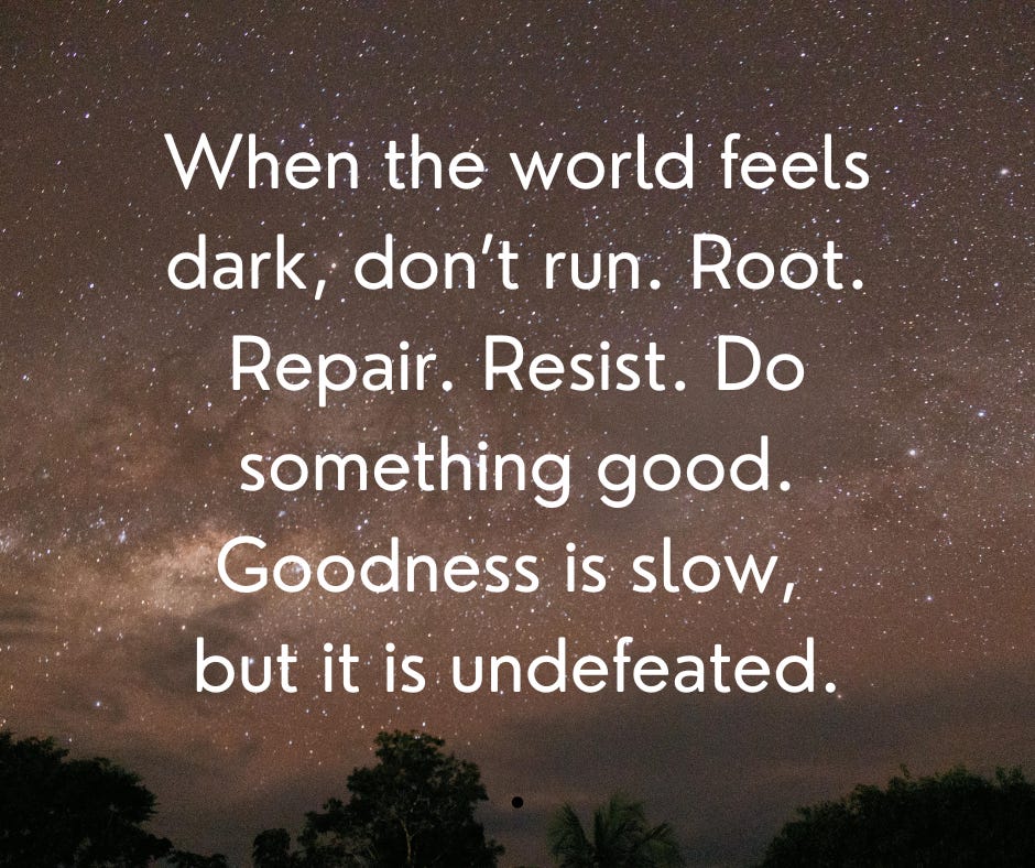 When the world feels dark, don’t run. Root. Repair. Resist. Do something good. Goodness is slow, but it is undefeated.
